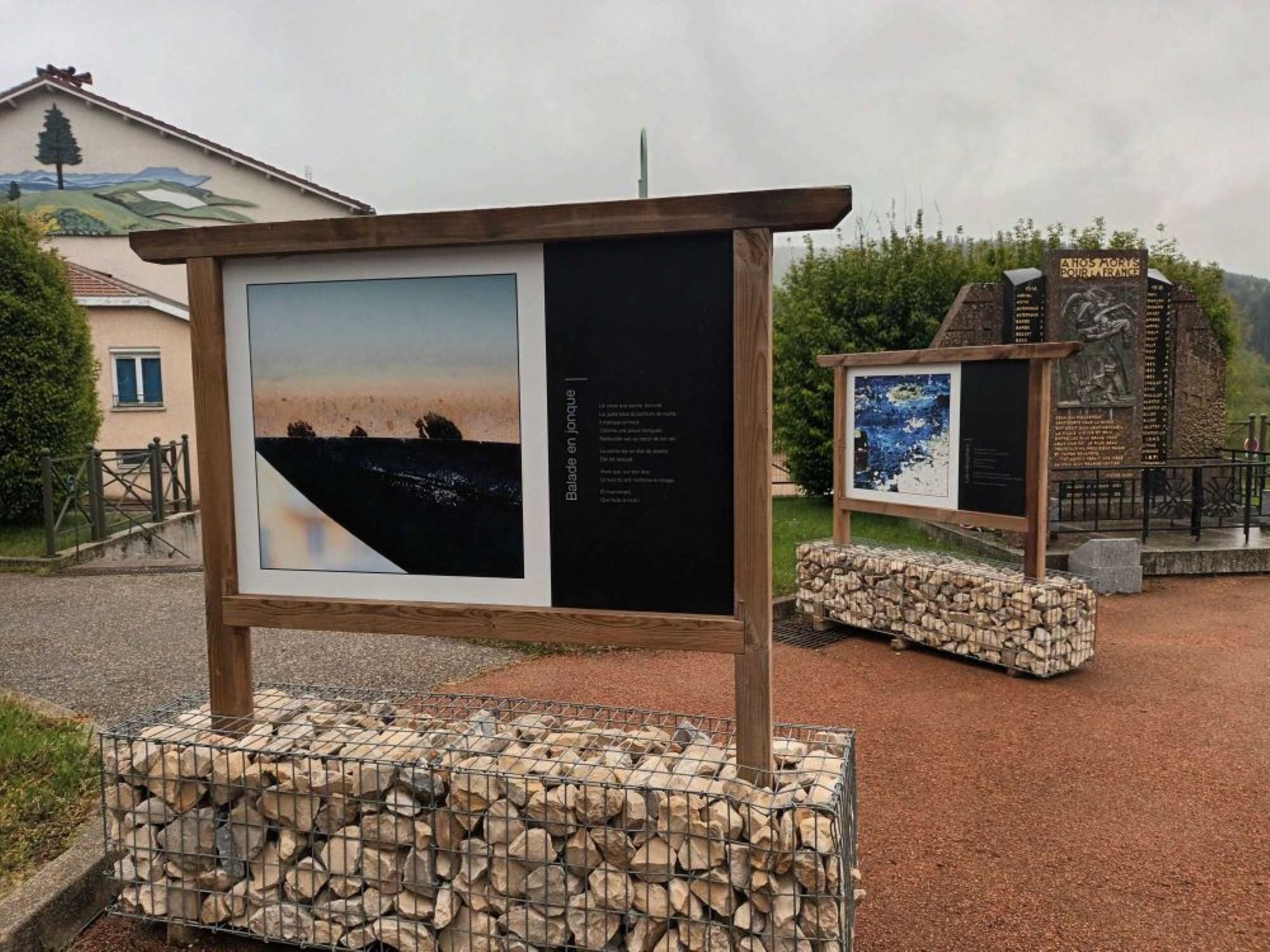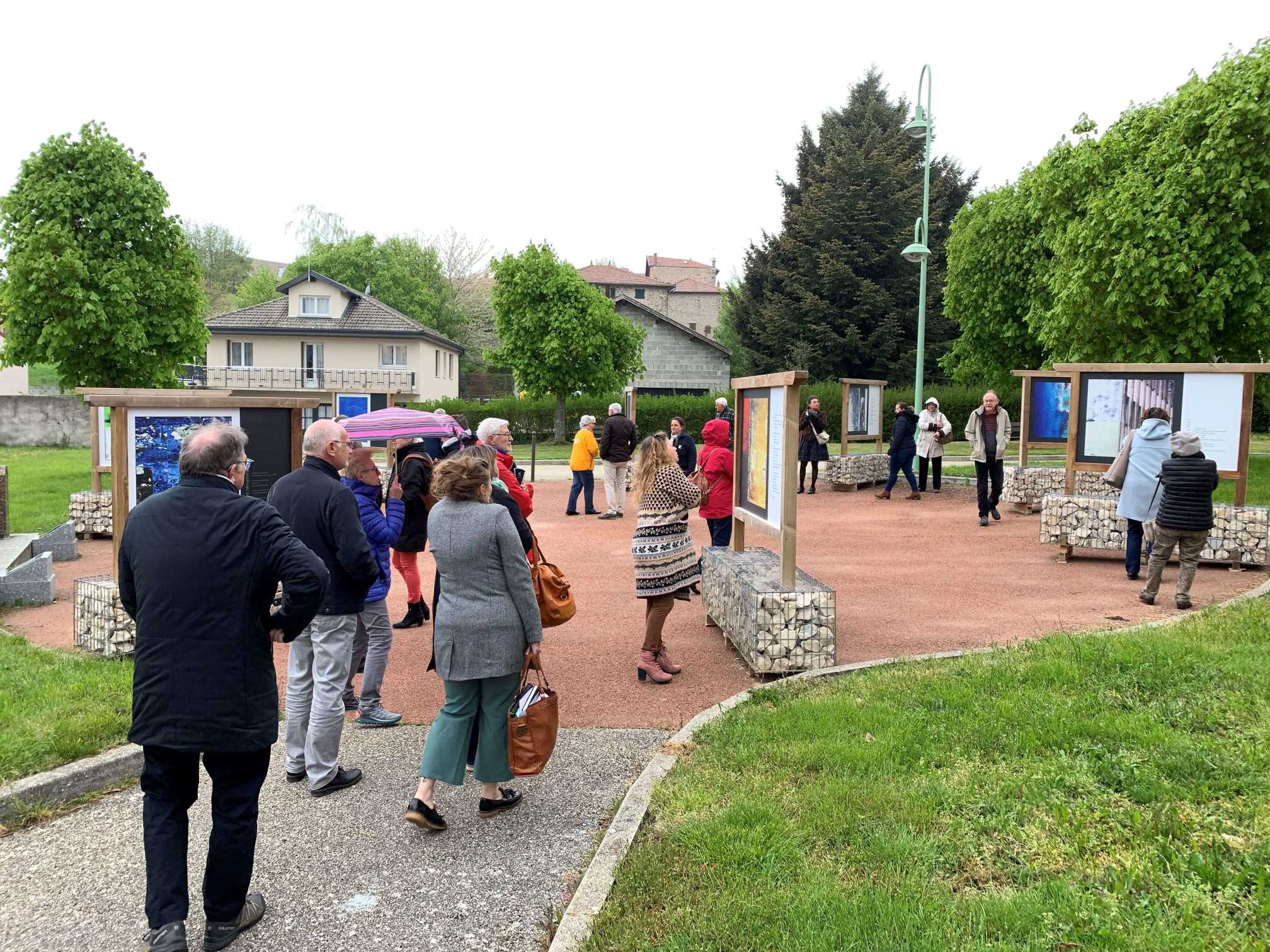 Le 16 mai, le ciel était couvert, la température hivernale, mais le village s’est embelli d’une magnifique exposition. Dix panneaux répartis en cercle, comme dix rayons de soleil, illuminent la place des Marronniers pour toute la saison estivale.