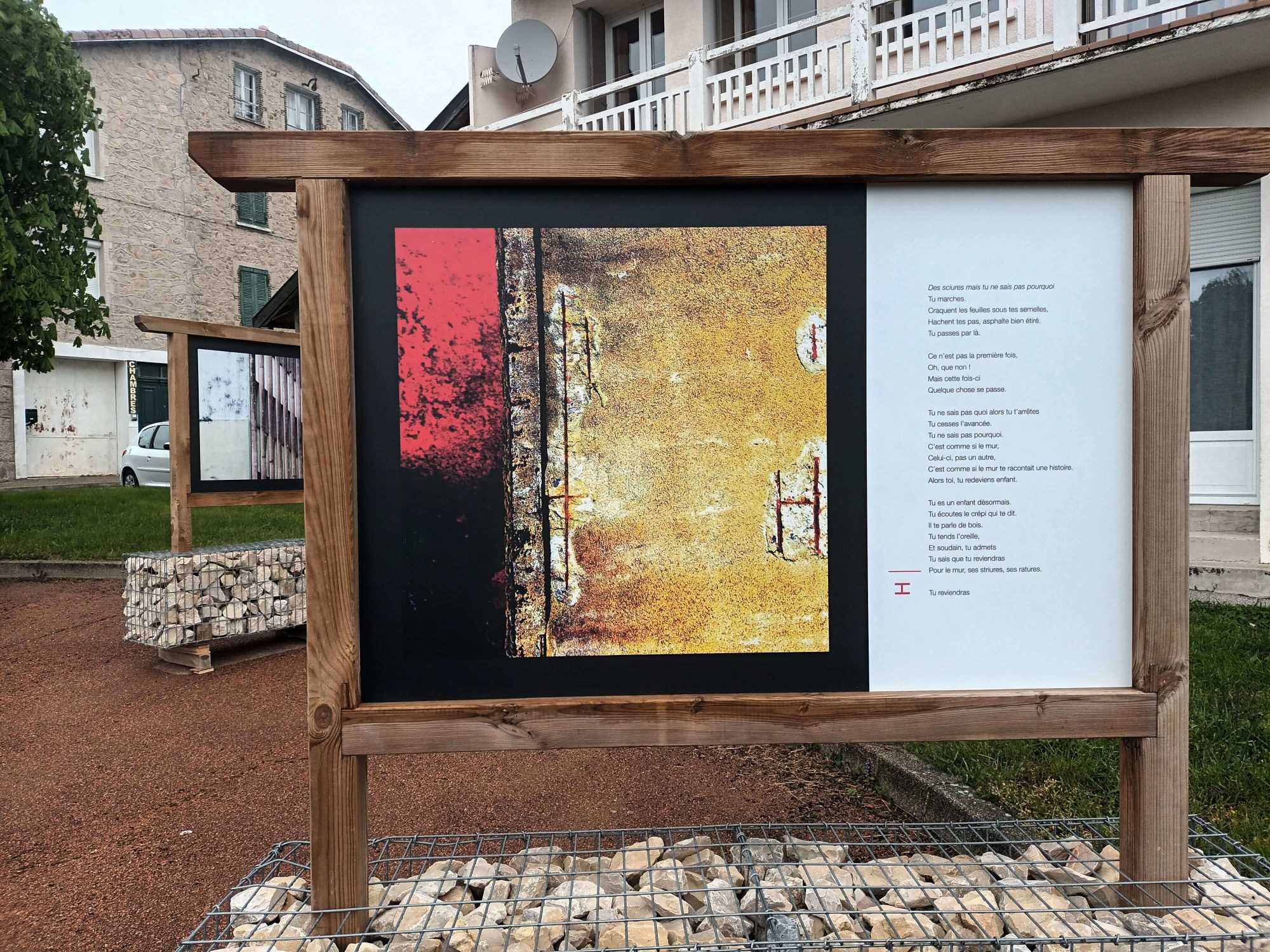 Michel Cardot photographie au fur à mesure de sa déambulation des tableaux du quotidien qu’il cadre pour les rendre indéchiffrables, impossibles à remettre dans leur contexte, à reconnaître. Puis il en sature les couleurs pour donner un effet pictural, comme une peinture. Il en ressort des tableaux abstraits, magnifiques, rehaussés par les textes de sa complice, à découvrir, voir et revoir pendant six mois sur une place du village.