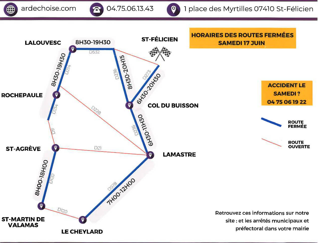 Les routes départementales en direction de St Félicien et de Rochepaule à partir de Lalouvesc seront entièrement fermées de 8h30 à 19h30.