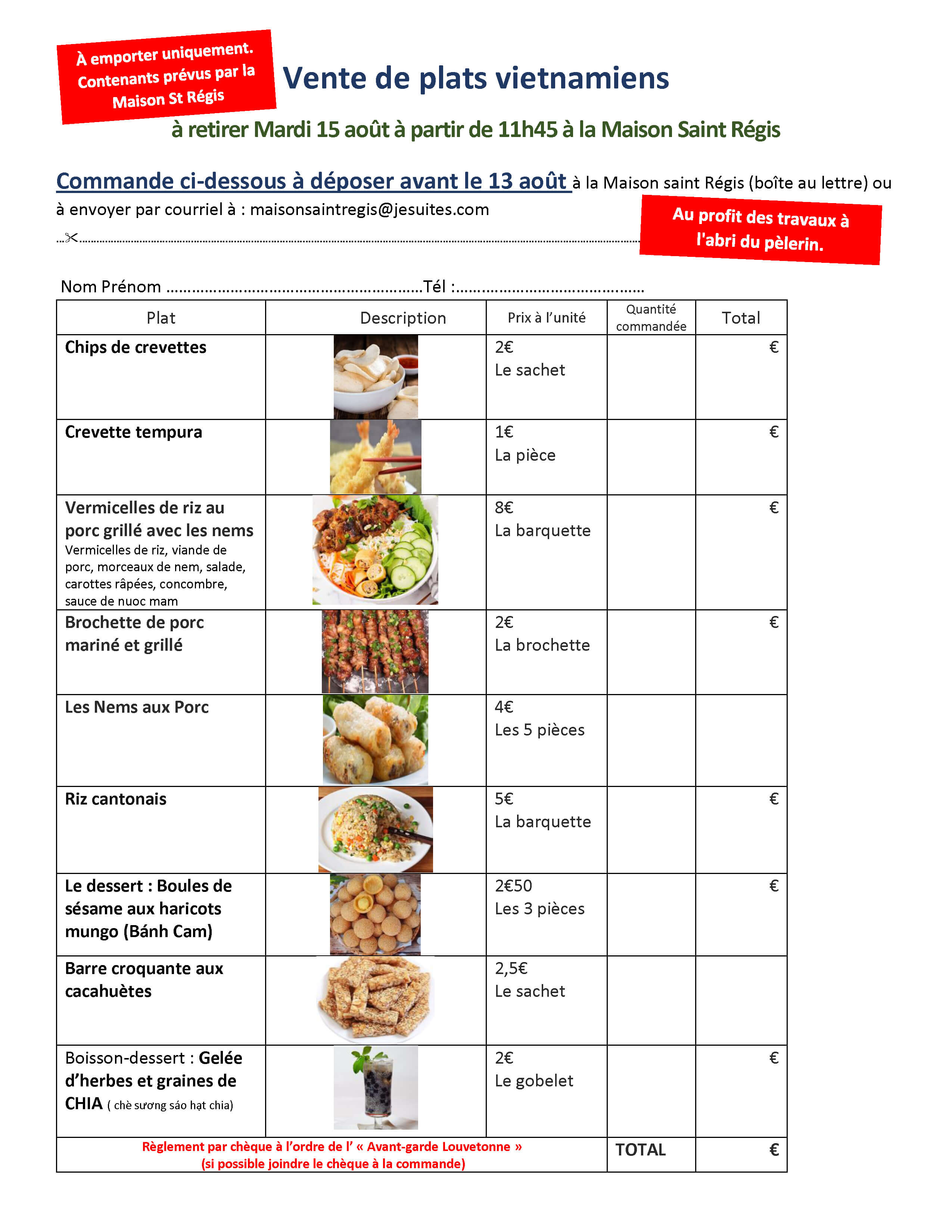 Une vente de plats vietnamiens est prévue le mardi 15 août 2023 à partir de 11 h 45 à la maison Saint Régis à emporter uniquement. La recette est destinée à financer les travaux à effectuer l’Abri du pèlerin