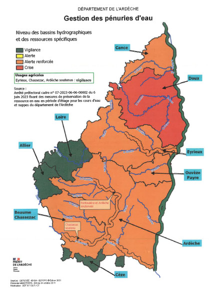 Les évolutions constatées et les prévisions météorologiques des prochains jours nécessitent donc la prise d’un nouvel arrêté préfectoral en date du 08 août 2023 plaçan en niveau « CRISE » le bassin versant du Doux.