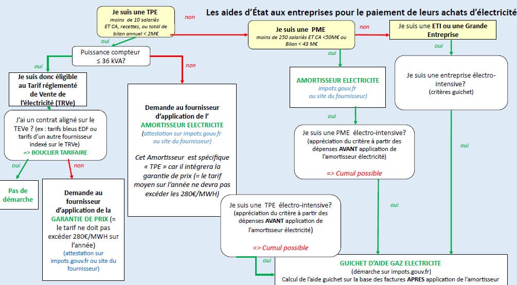 - Enfin, pour l’ensemble des entreprises grandes consommatrices d’énergie, le guichet d’aide au paiement des factures de gaz et d’électricité permet de compenser la hausse des coûts d’approvisionnement de gaz naturel et d’électricité dès lors que le coût de l’énergie dépasse 3% de leur chiffre d’affaires en 2021 et que leur facture a augmenté de 50% par rapport à 2021. Ces dispositifs sont cumulables sous certaines conditions.