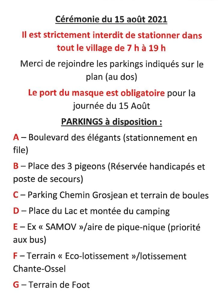 Chaque année Lalouvesc reçoit entre 1000 et 1500 visiteurs souhaitant assister à la messe du 15 août sur le Parc des Pèlerins. Comme l’année dernière où l’organisation a été satisfaisante, tout stationnement sera rigoureusement interdit dans le village et des parkings sont prévus à la périphérie, pour que la circulation automobile et pédestre se passe en toute convivialité et sécurité.