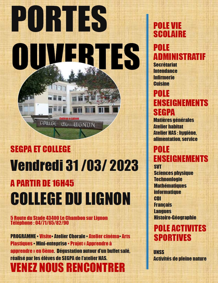 - 31 mars : SEGPA et Collège du Lignon 04 71 65 82 00 (SEGPA = Section d’enseignement général et professionnel adapté )