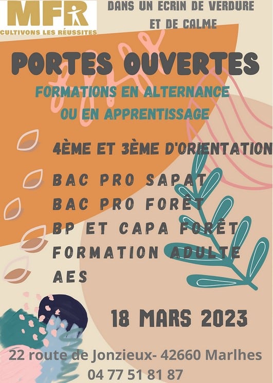 - 18 mars : Formation par alternance, MFR Marlhes 04 77 51 81 87 (MFR = Maison familiale rurale )