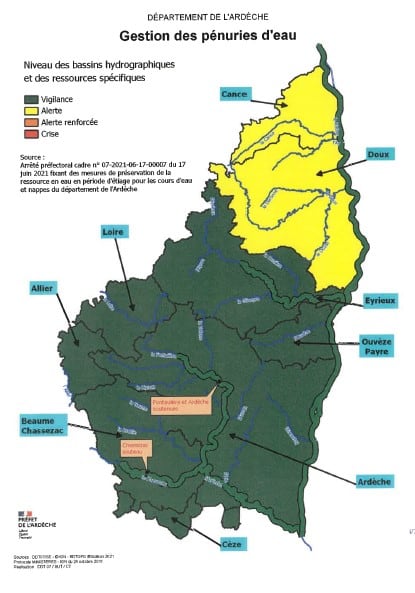 Face à cette situation hydrologique inédite pour un début du mois de mars, le préfet de l’Ardèche a classé ces bassins au niveau « ALERTE » et y impose les limitations des usages de l’eau.