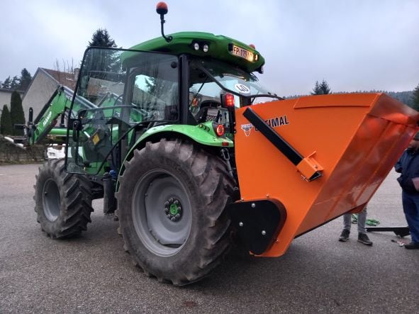 L’ancienne saleuse vieillie était hors service. Il en fallait une nouvelle, elle est arrivée et a été montée sur le tracteur.