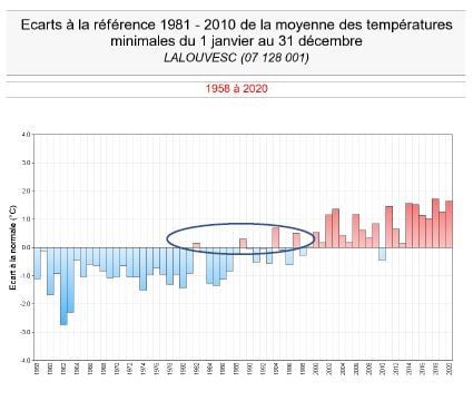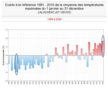 Le constat est sans appel : il fait de moins en moins froid et de plus en plus chaud à Lalouvesc, même si quelques années s’écartent de la tendance générale. 2020 est l’année la plus chaude depuis 50 ans.