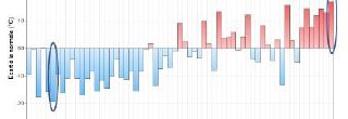 Le premier montre la différence de la moyenne annuelle des températures minimales quotidiennes mesurées chaque année par rapport à une référence fixe (la moyenne de ces températures sur 30 ans, de 1981 à 2010).