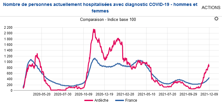 Si vous n’êtes pas convaincus, jetez donc, une nouvelle fois, un œil sur la courbe actualisée des hospitalisations pour cause de Covid. La tendance de l’Ardèche (en rouge) a très largement dépassé celle de la France. Il y a actuellement 108 hospitalisés en Ardèche… ils étaient 8 en octobre.