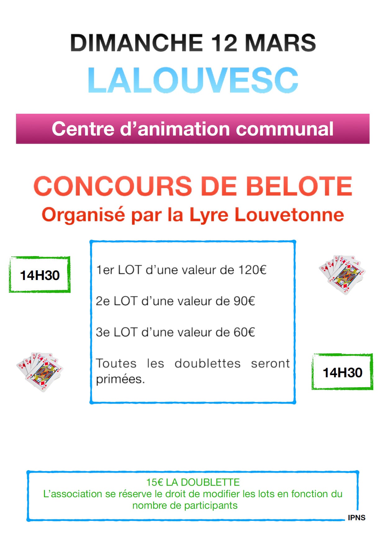 Inscription 15 € la doublette. Toutes les doublettes primées.