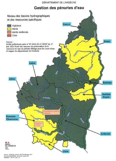 En raison de la baisse des débits des cours d’eau, le préfet a décidé par arrêté préfectoral du 14 avril 2023 de classer les bassins de l’Ouvèze-Payre, de la Beaume-Chassezac, du Doux-Ay et de la Cèze en situation d’ALERTE (avec des réductions des usages agricoles, domestiques, et publics).