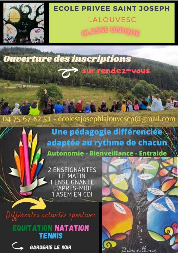 Inscriptions sur rendez-vous : 04 75 67 82 51, ecolestjosephlalouvesc@gmail.com