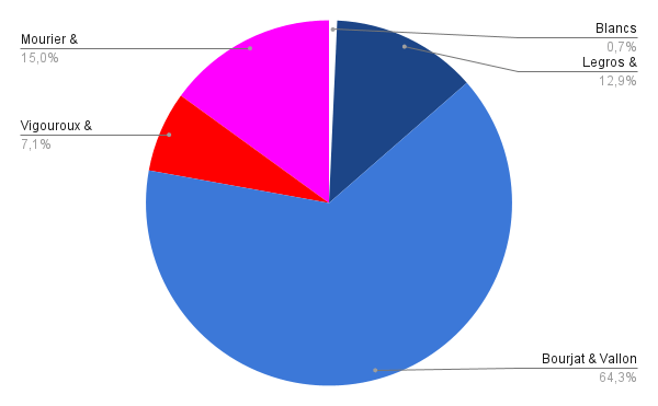 - Aurélien Mourier & Marie Vercasson (BC-DVG, Divers gauche) : 2 101 voix, 29.34 %