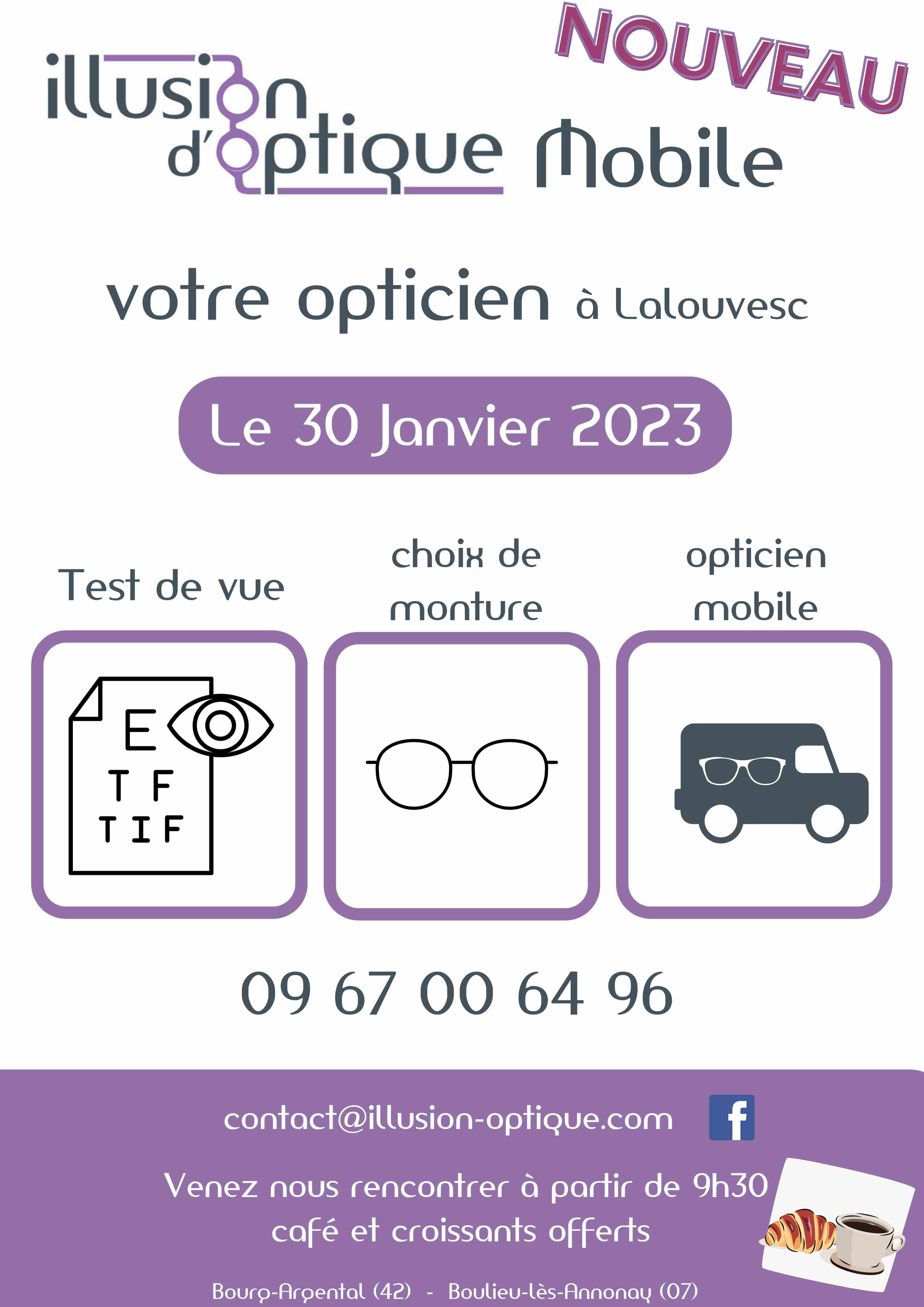 Un camion optique ambulant du magasin “Illusion d’optique” sera présent à Lalouvesc le 30 janvier à partir de 9h30, café & croissants offerts.