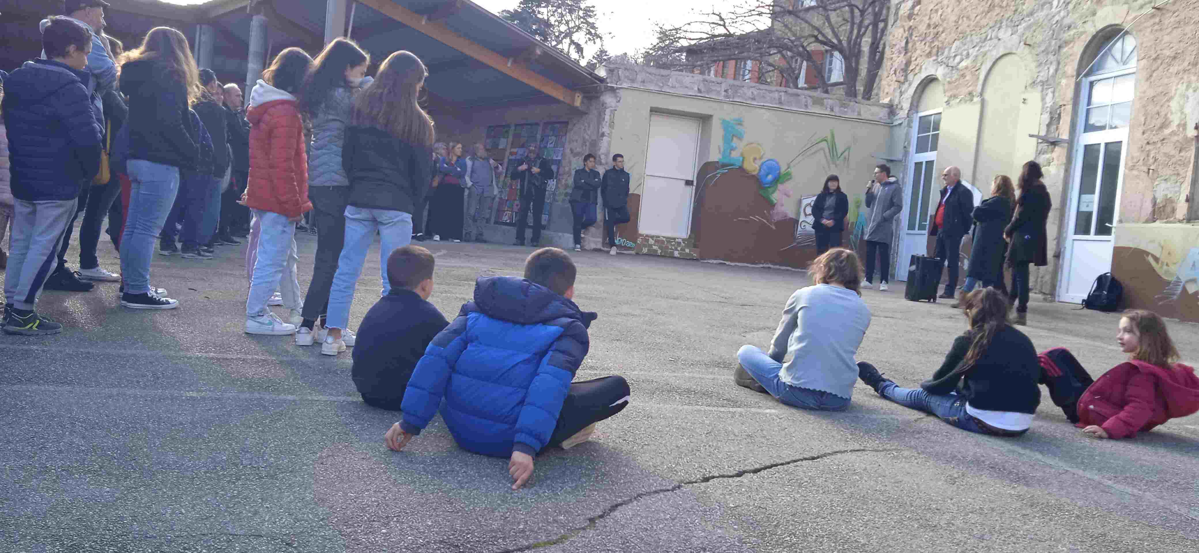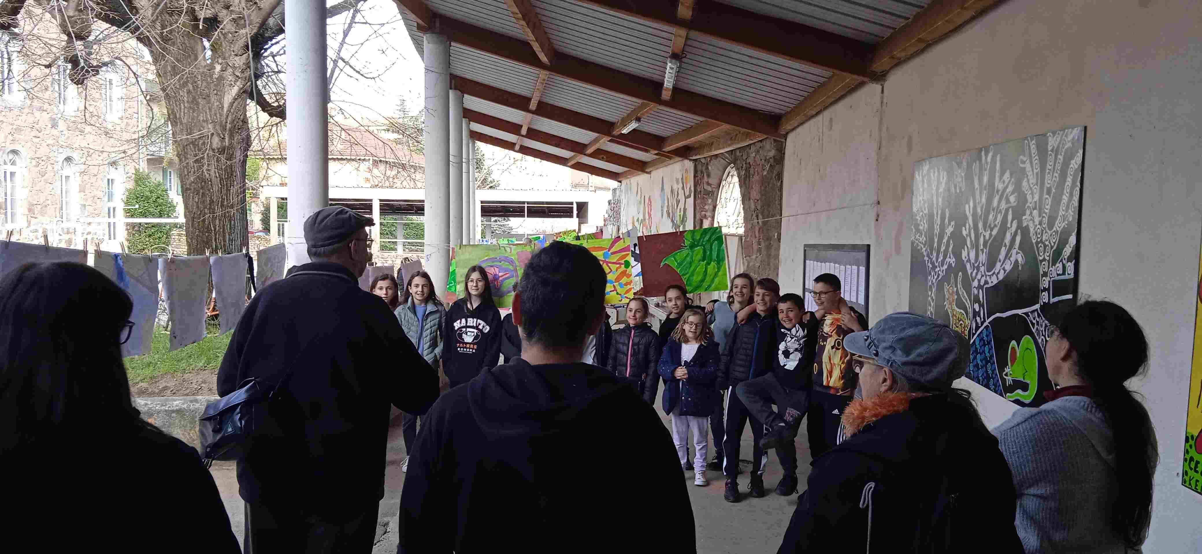 Le 6 avril, dans la cour de l’école primaire de Satillieu, 80 enfants et parents ont assisté au vernissage de l’exposition des dessins et peintures réalisés dans trois classes de sixième du collège St Joseph et deux classes de l’école primaire de St Jean-Baptiste de la Salle.