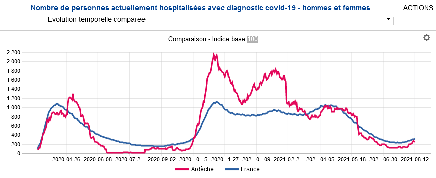 Pour ceux qui sont encore sceptiques, nous suivons régulièrement sur lalouvesc.fr l’évolution de la courbe des hospitalisations pour la Covid 19 en Ardèche. Ci-dessous, son dernier état, les hospitalisations sont reparties brutalement à la hausse. Aujourd’hui 85% des hospitalisés n’ont pas été vaccinés et leur âge moyen baisse. Il ne faut pas que la courbe de cette automne ressemble à celle de l’automne dernier. N’oublions pas que le village n’a pas été épargné.