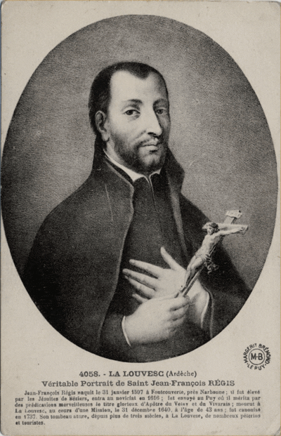 Saint Régis (ou Saint Jean-François Régis) est né à Foncouverte dans l’Aude le 31 Janvier 1597, d’une famille de nobles ruraux assez aisés et profondément chrétiens. Vers ses 14 ans, il est envoyé pour ses études au Collège des Jésuites de Béziers. Il s’y montre travailleur et bon camarade. Il devient membre de la Congrégation de la Sainte Vierge. Ses études terminées, il entre au Noviciat de la Compagnie de Jésus à Toulouse le 8 décembre 1616. Après ses premiers vœux en 1618, il poursuit la longue formation des Jésuites, coupée par des périodes où il enseigne lui-même. Il ira ainsi à Cahors, à Billom, à Tournon, au Puy et à Auch. Il fait ses études théologiques à Toulouse où il est ordonné prêtre en mai 1631.