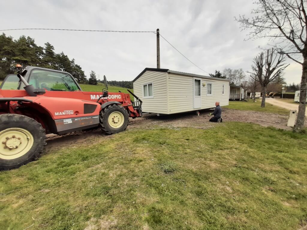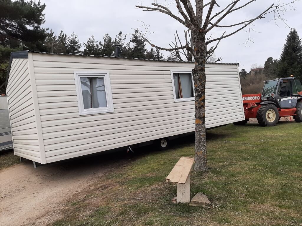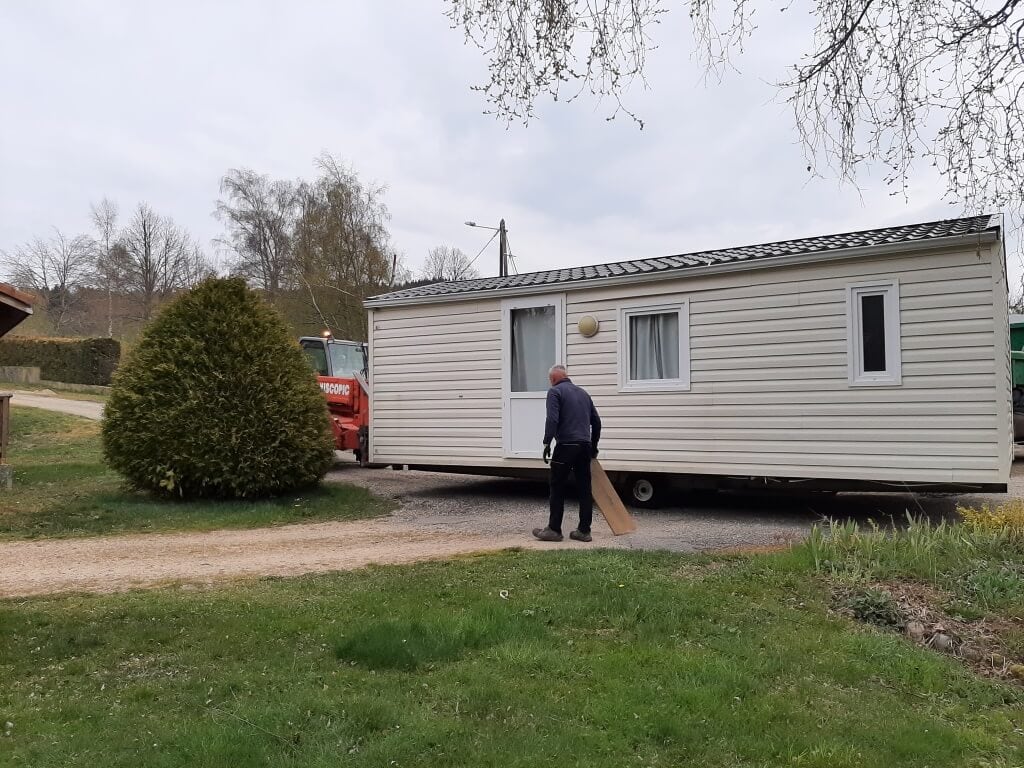 Deux mobil-homes situés en bas du camping ont trouvé une meilleure place, tout en haut, à côté de leurs congénères. Il y aura ainsi un village de mobil-homes au sommet du camping. Ce fut un impressionnant déménagement !