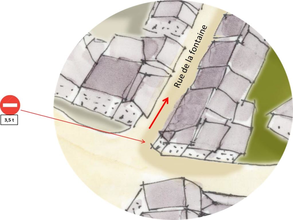 La rue de la fontaine est une rue étroite, fragile et historique du village, empruntée par de nombreux piétons. Elle est mise en sens unique dans le sens de la montée. De plus, elle est interdite aux poids lourds qui dégradent la chaussée.