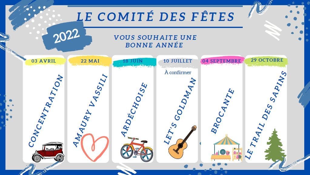 À toutes et à tous le Comité des Fêtes propose de retenir ces quelques dates. Nous n’épargnerons pas notre énergie pour qu’un grand bol de convivialité souffle dans le village lors de ces journées.