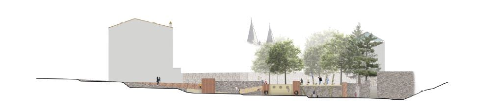 L’idée des concepteurs est de placer le jeu dans le prolongement du mur de soutènement qui marque la fin de la parcelle Beauséjour et surplombe la parcelle récupérée par la Mairie à la copropriété. Ainsi une terrasse en bois prolonge le surplomb existant. En dessous, la terrasse dessine plusieurs cabanes abritant des jeux : toboggans, échelles, mur d’escalade, etc qui permettent aux enfants de partir à l’assaut de la terrasse ou de descendre au niveau inférieur par des percements. Côté nord un accès creusé en pente douce permet une descente facile pour les adultes, les poucettes ou les personnes à mobilité réduite.