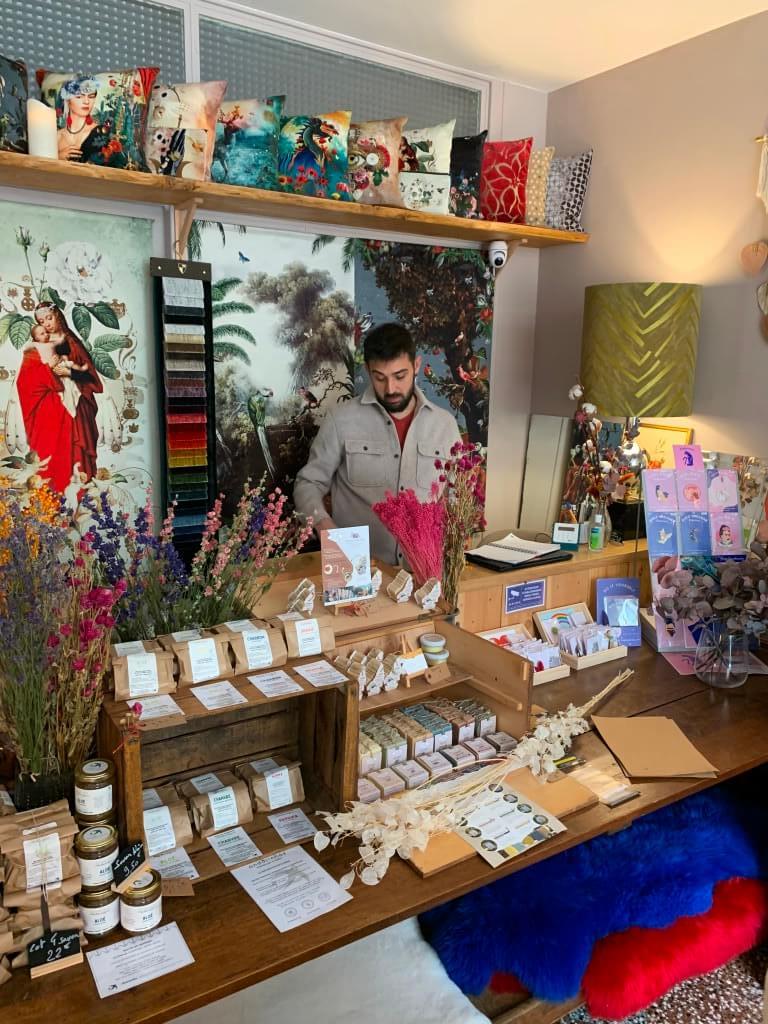 La région Auvergne-Rhône-Alpes y est largement exposée à travers des luminaires, carnets, horloges coussins, tote bags, mugs isothermes, savons, shampoings solides… et aussi une épicerie fine de produits locaux. Des créateurs d’autres régions sont aussi mis en avant. Les visiteurs ont ainsi l’opportunité de se faire plaisir et de faire plaisir en trouvant leur coup de cœur dans les univers représentés tels que les macramés, les tentures murales, coussins, fleurs séchées, jeux, bougies, thés…