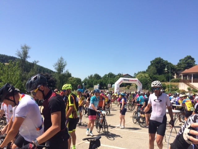 Les vélos sont prêts, équipés de leur plaque/dossard récupéré la veille, et chargés dans le kangoo. Après un petit déjeuner copieux, direction Saint-Félicien, pour déposer nos bagages et prendre le départ vers 6h30.