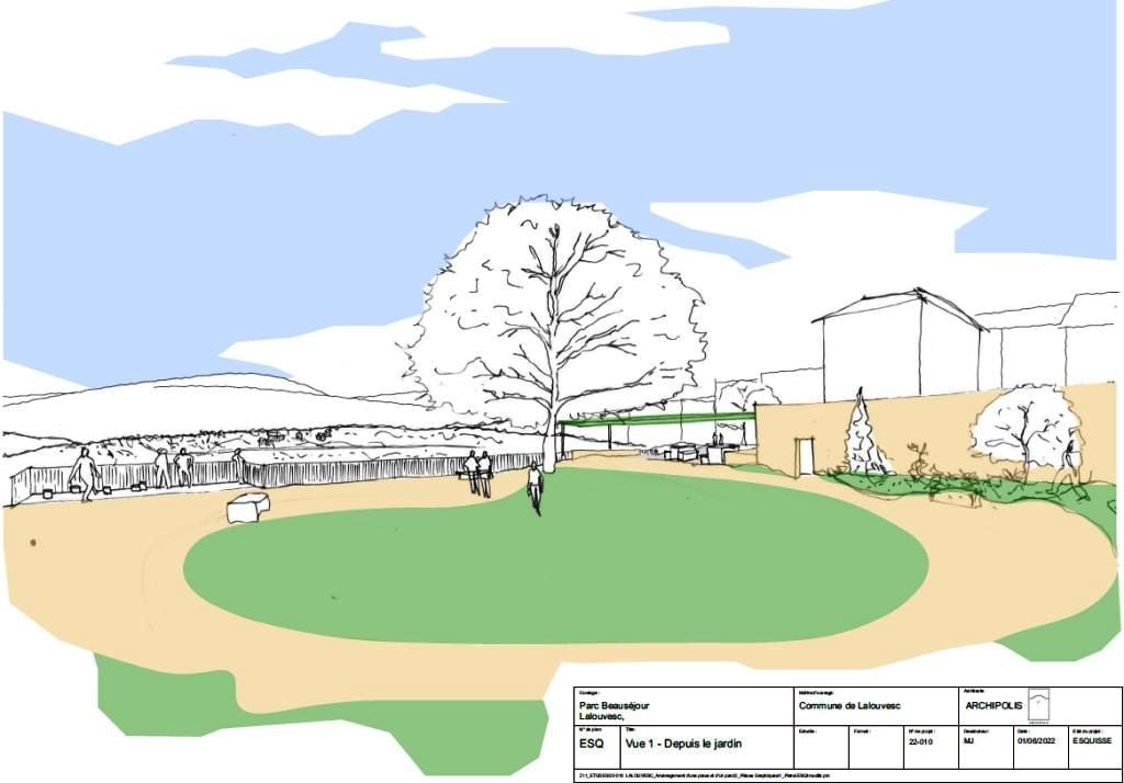 Un jardin reprenant l’ancien jardin de l’hôtel, comprend principalement d’une grande pelouse dans laquelle le marronnier serait gardé. le jardin sera bordé par une terrasse belvédère, constituée par la partie supérieure du mur-habité (jeux d’enfants).