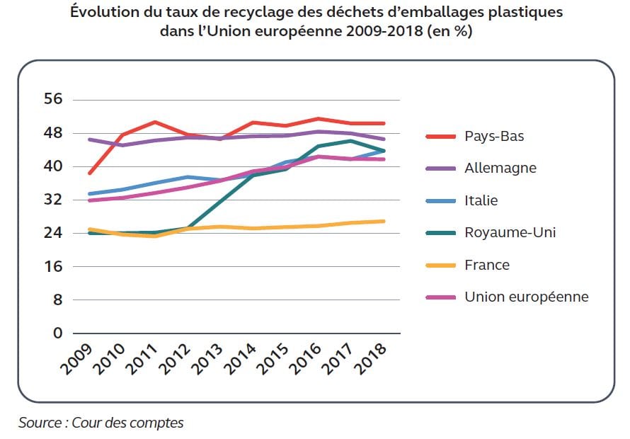 montre que la France est en retard sur la gestion des déchets. Les objectifs affichés sont très loin d’avoir été atteints et le pays fait pale figure comparé à l’Allemagne, l’Autriche, les Pays-Bas…. La Cour dénonce notamment des acteurs « insuffisamment coordonnés », un dispositif de suivi « toujours défaillant » et un financement « peu lisible et trop faiblement incitatif ».