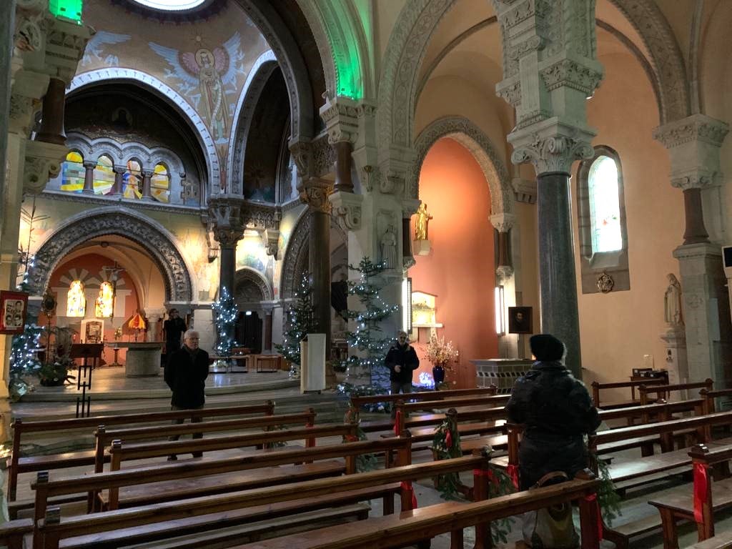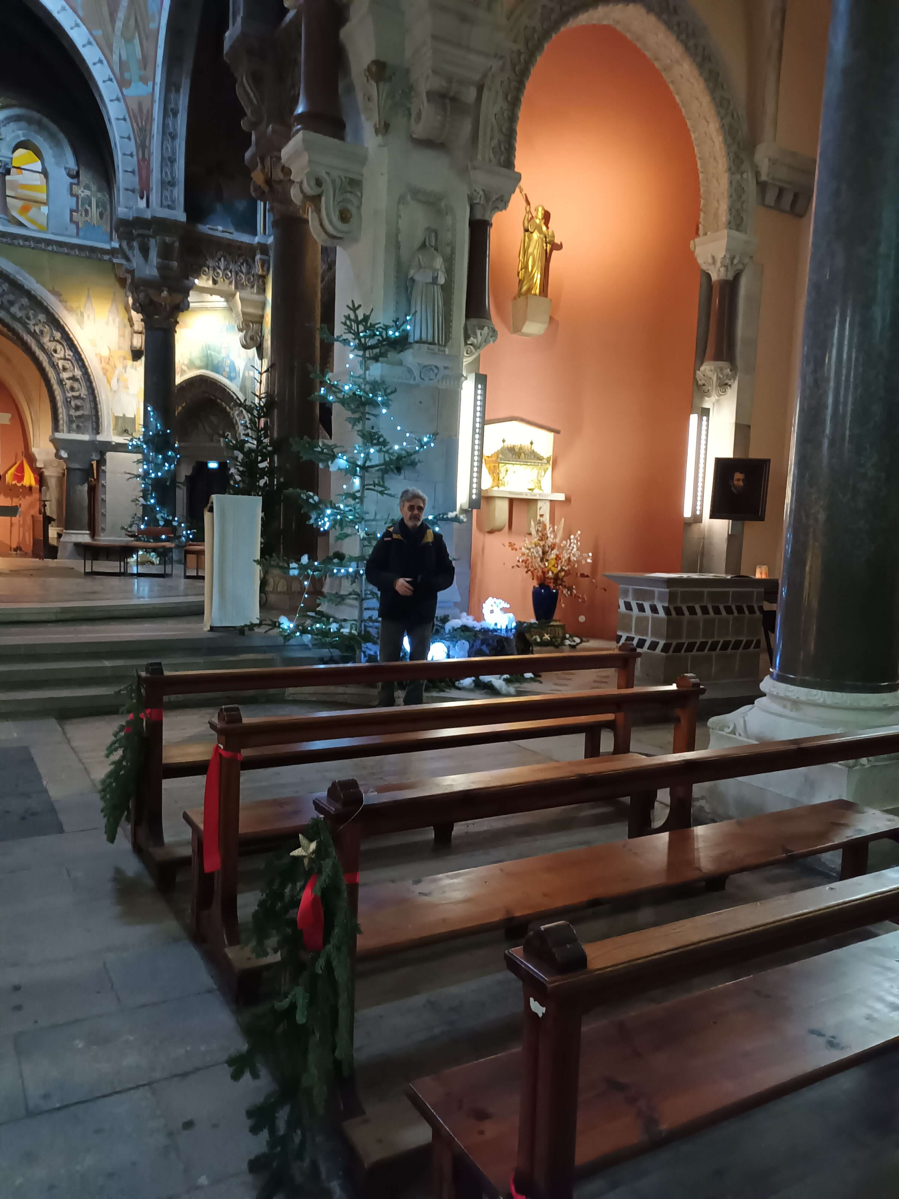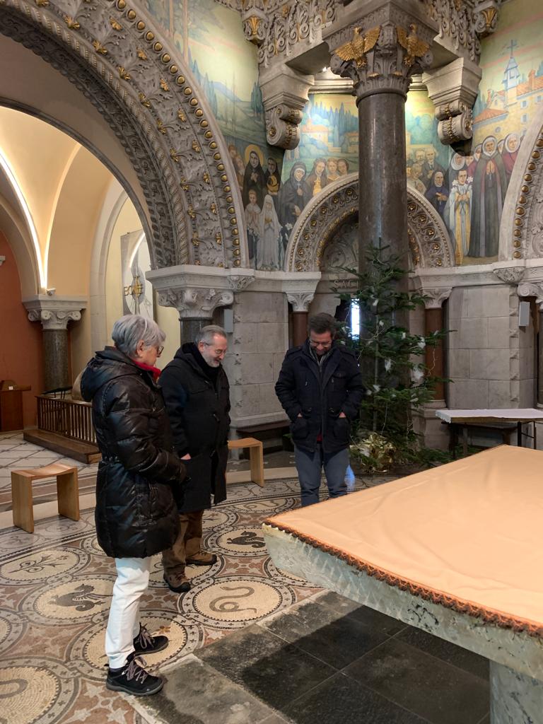 Jeudi 19 janvier, Le frère Yves Stoelen et l’équipe du Carrefour des Arts ont accueilli en la Basilique une délégation de musiciens : Gualtiero Dazzi compositeur, Christophe Galland récitant, Loïk Blanvillain chef de chœur, Thibaut Martin choriste et acousticien.