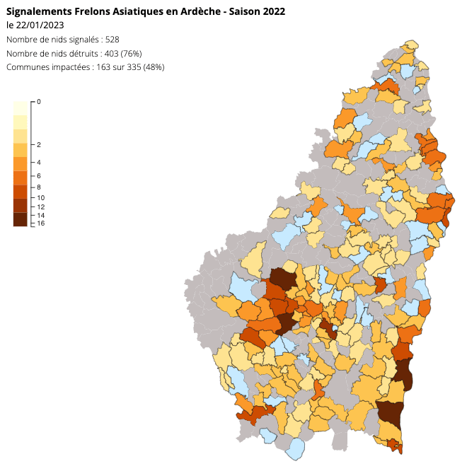 Le nombre de nids est inférieur à celui de 2021 en basse vallée du Rhône ainsi que pour Beaume Drobie. Il est par contre élevé en centre ouest du département (Source et Volcans, bassin d’Aubenas…). Les frelons poursuivent leur progression en nord Ardèche. Quelques gros nids signalés à plus de 900 m d’altitude, favorisés par la chaleur.
