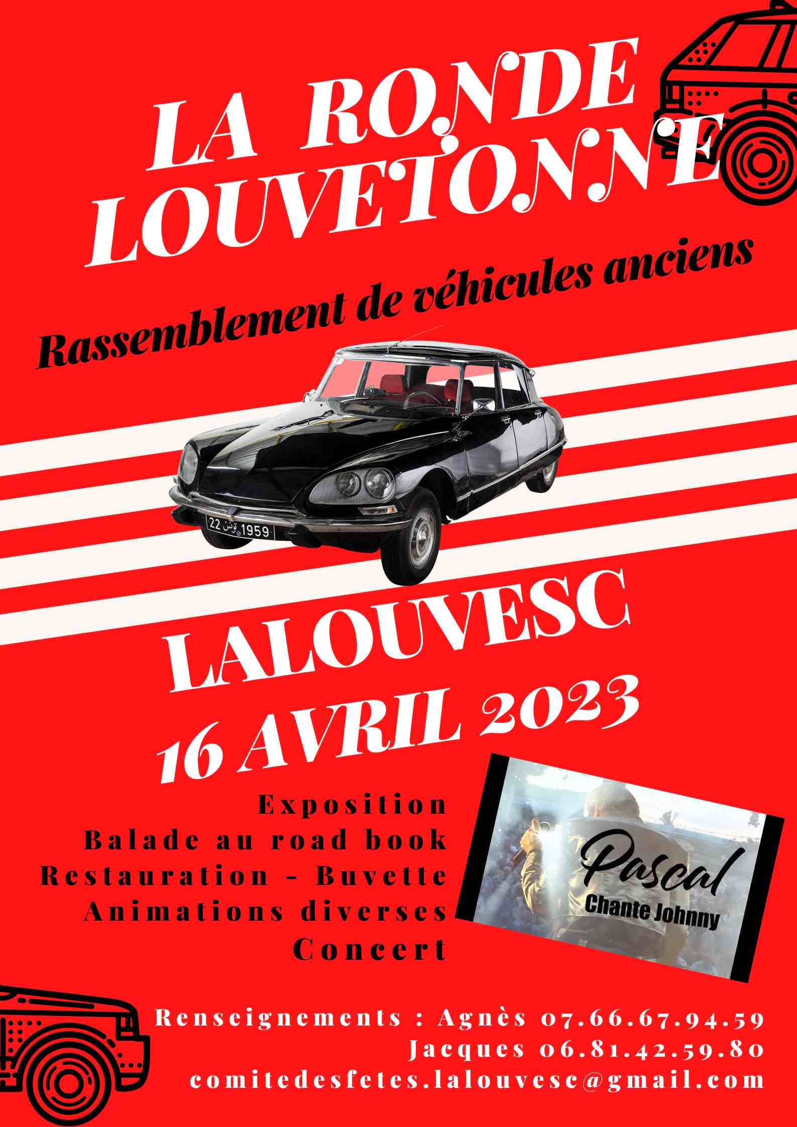2023 renoue avec l’organisation d’un concert l’après-midi. Pascal chante Johnny enchantera et mettra le feu sur le site où nous attendons quelques 150 voitures et un public nombreux. Ce moment plus rock & roll apportera une touche supplémentaire de peps à ces quelques 150 bijoux qui auront, le matin même, apprécié la balade au road book. Cette balade offrira comme toutes les années tout le charme de nos petites routes sillonnant notre si belle région. Balade et non pas course de vitesse : chacun son pas, chacun son rythme. Un apéritif/étape sera proposé le temps que ces petits bijoux reprennent leur souffle avant de reprendre la route pour rejoindre Lalouvesc…