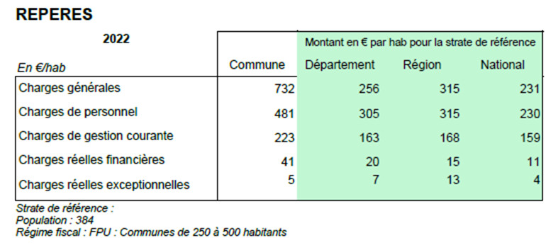 Il n’est malheureusement pas possible de rendre compte des tendances sur plusieurs années du fait des changements de méthodes comptables en 2020 (intégration des budgets annexes eau et assainissement dans le budget général à la demande de la DGFIP). Mais un document fourni par notre conseiller financier autorise d’éclairantes comparaisons avec des Communes de taille équivalente sur le Département, la Région et l’ensemble du pays.