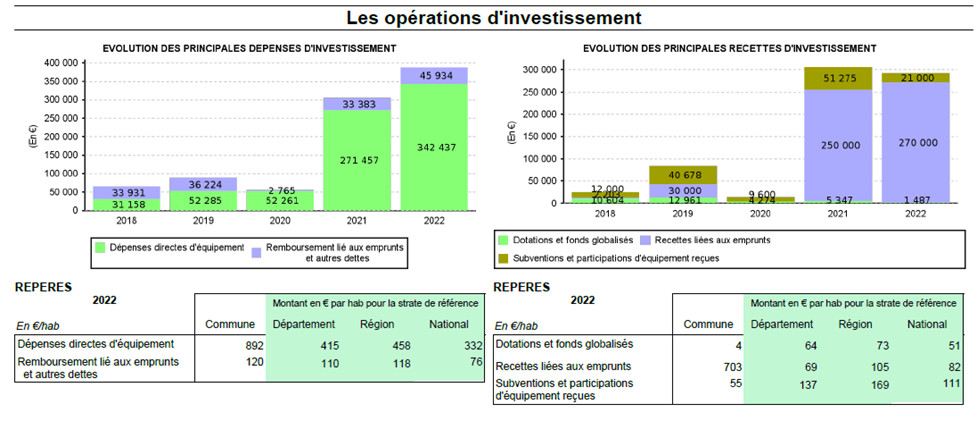 L’augmentation forte des dépenses d’investissement, ici significative sur l’évolution des cinq dernières années, témoigne de la politique de relance du village (camping, mairie, cimetière, Beauséjour, écolotissement, voirie, murs…) que nous avons engagée. C’est encore évident, si l’on compare les dépenses d’équipement par habitant, le double environ de celui des autres communes de même taille pour l’année 2022.