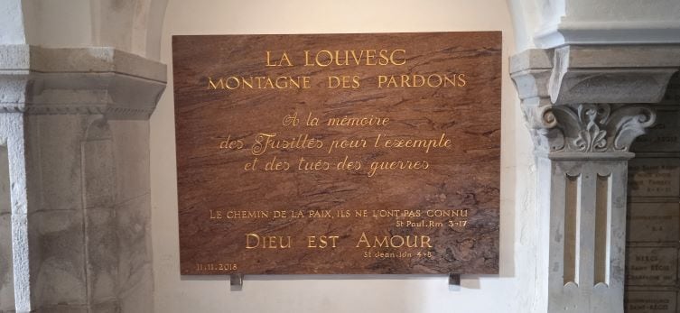 Cet été il y aura une exposition à la crypte de la Basilique sur le thème de la première guerre mondiale et des fusillés pour l’exemple : elle permettra d’expliciter la plaque commémorative : Lalouvesc, La montagne des pardons, A la mémoire des Fusillés pour l’exemple et des tués des guerres.