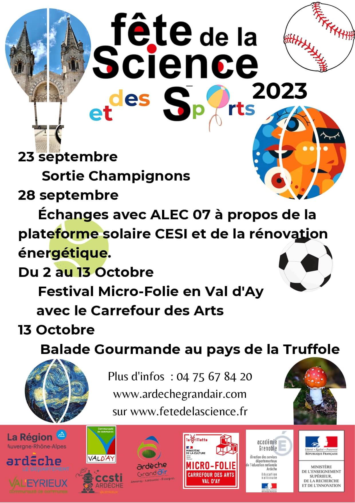 Dans le cadre de la fête de la science, l’Office de tourisme du Val d’Ay est partenaire d’ALEC 07 (Agence Locale de l’Énergie et du Climat de l’Ardèche), qui propose un événement, à destination des professionnels autour de la rénovation énergétique pour adapter son établissement aux variations de température pour un tourisme 4 saisons à Lalouvesc (à proximité de l’office de tourisme et dans la Maison Saint Régis), le jeudi 28 septembre sur inscription .